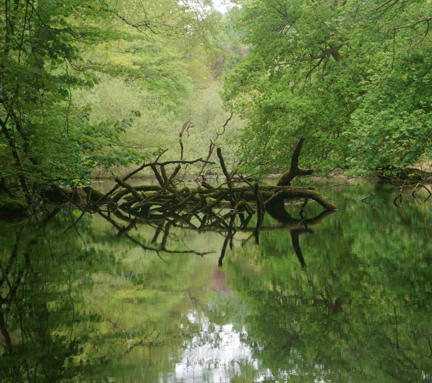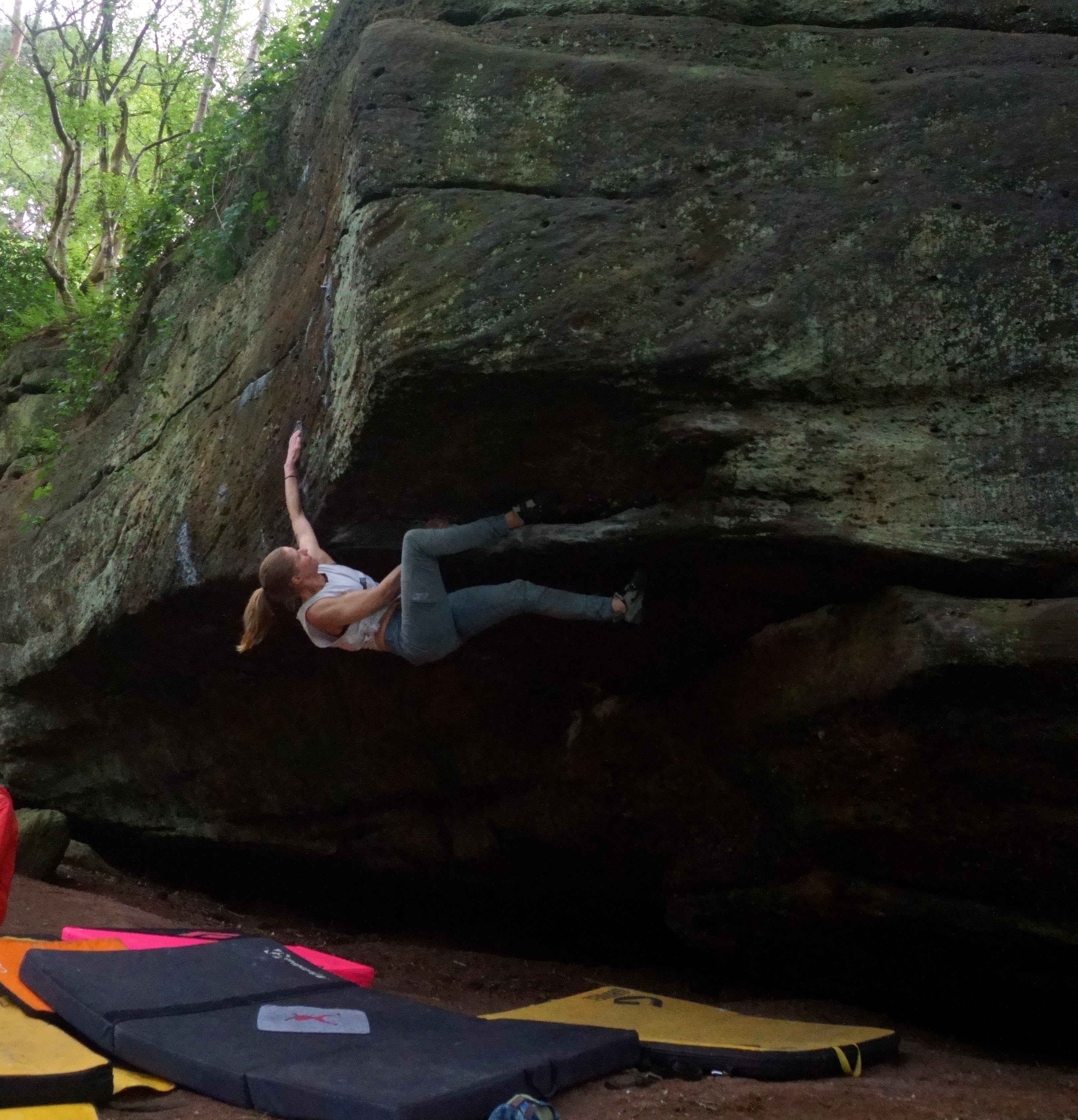 Dynamic power ebbing, we left Gentleman’s Rock and headed back down to the main path. The track courted the edge of the river, which in the sunlight, without a breath of wind, stood stock-still. It perfectly reflected the world above, a green mirror turning fallen, half-submerged branches into complex symmetry, ritualistic talismans. We emerged back out into the gardens of the Rambler’s Retreat, briefly coming up for air before delving back into the trees on the other side of the road, this time Farley’s Wood. We dropped down the side of a bridge and crossed a boggy stream to head up to Discreet Block for some pebble-pulling. Some of the sandstone here forms in a conglomerate manner, and this is the perfect example. Smooth, round pebbles stick half-out of the main sandstone matrix, providing undeniable crimping opportunities, for all their unsettling nature. They look like they shouldn’t be able to take your weight, like you should be able to pull them out of the wall, and yet they’re embedded so securely.