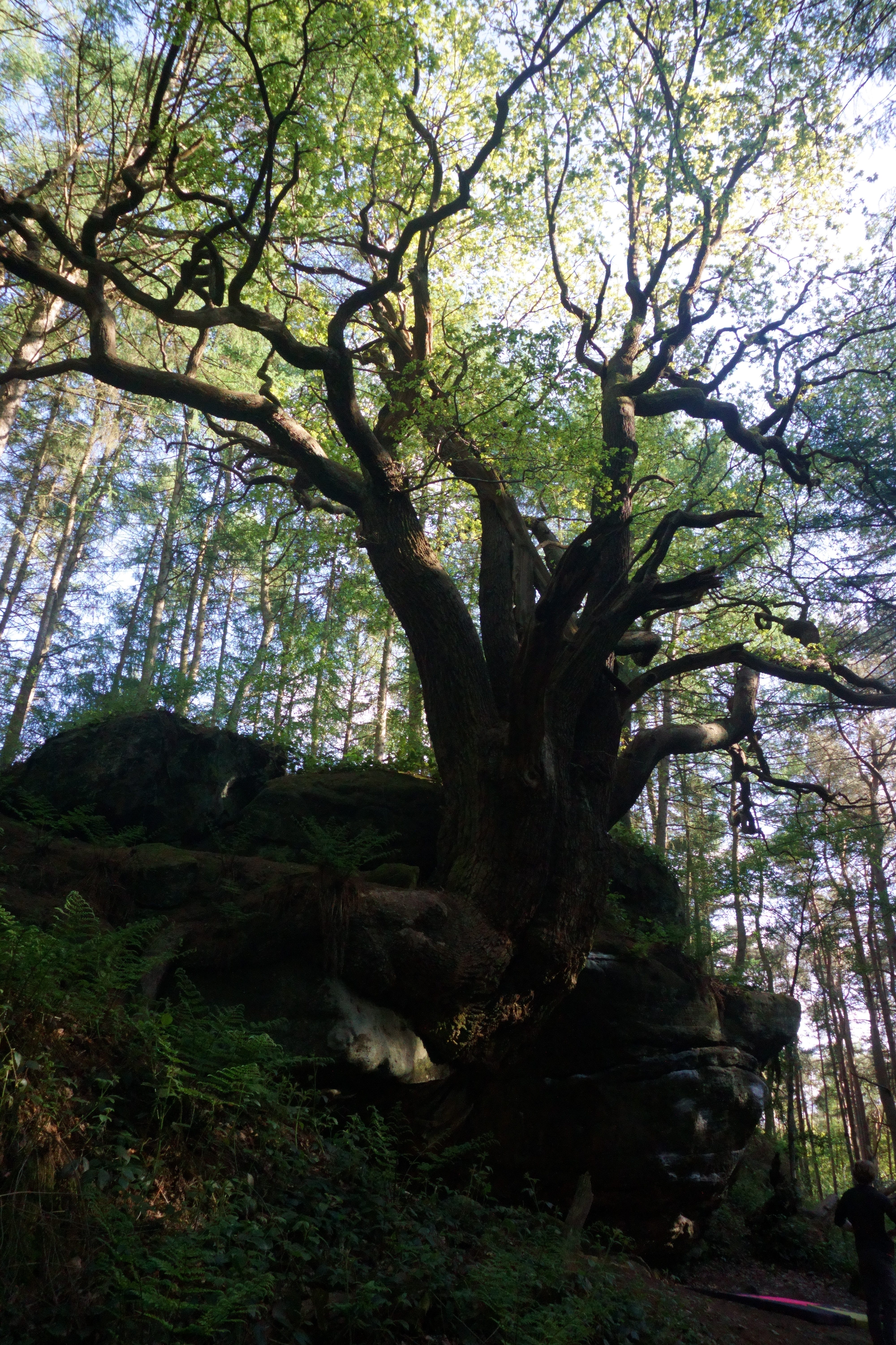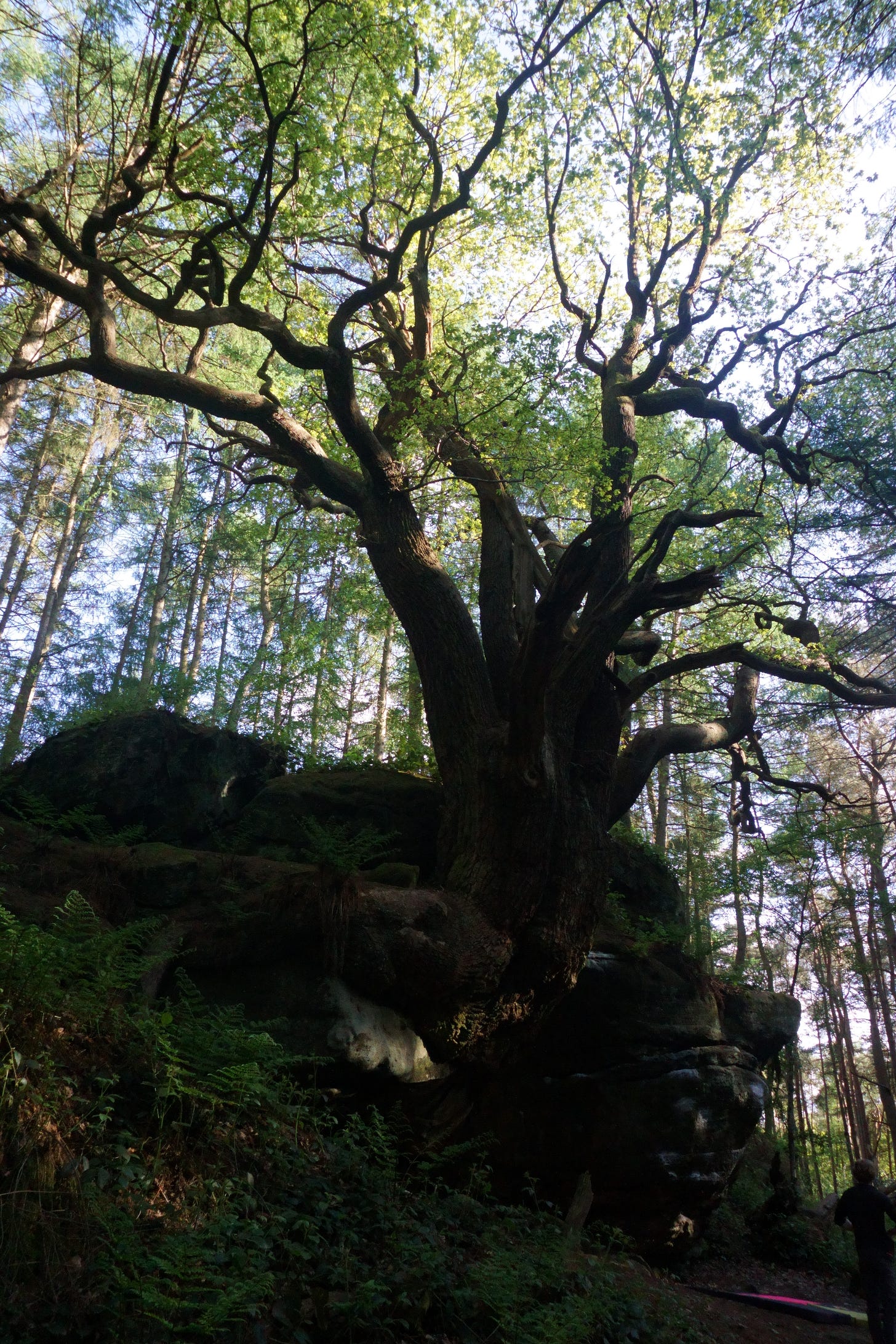 We were almost ready to call it a day, but not before one final boulder had been explored: The Amazing Tree Block, fully living up to its name. The huge tree burst directly out of the boulder, its ancient roots pouring out of the trunk and over the edge of the rock like a waterfall. If anything perpetuated the idea that these woods were enchanted, it was this tree. To add to illusion, occasional screams punctured the still air. In reality, drifting over from the rollercoasters of Alton Towers just a few fields over from the edge of the trees, but easy to imagine them as the cries of the bewitched, trapped in the gnarled branches of the tree. The problems there were more of the same huge moves, big slaps to distant holds from tight heel hooks. I did finally manage to send a couple of easy problems before the midges descended in force and we were forced to abandon the day, or risk being eaten alive.