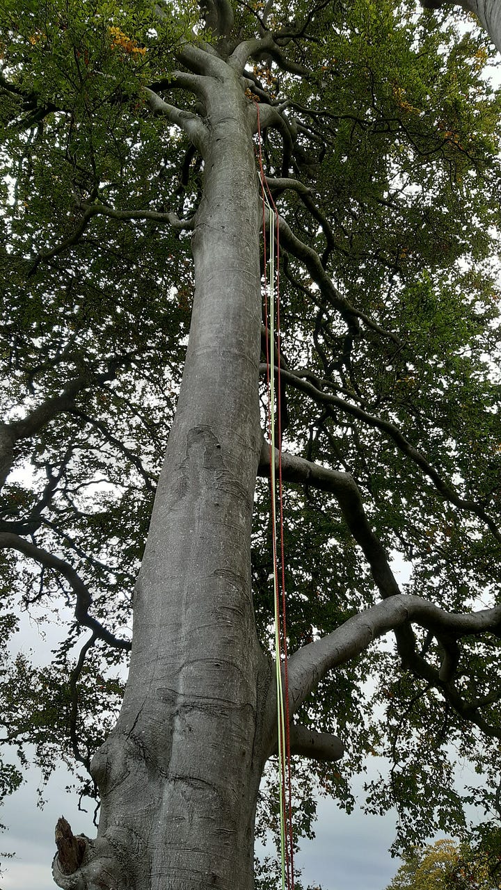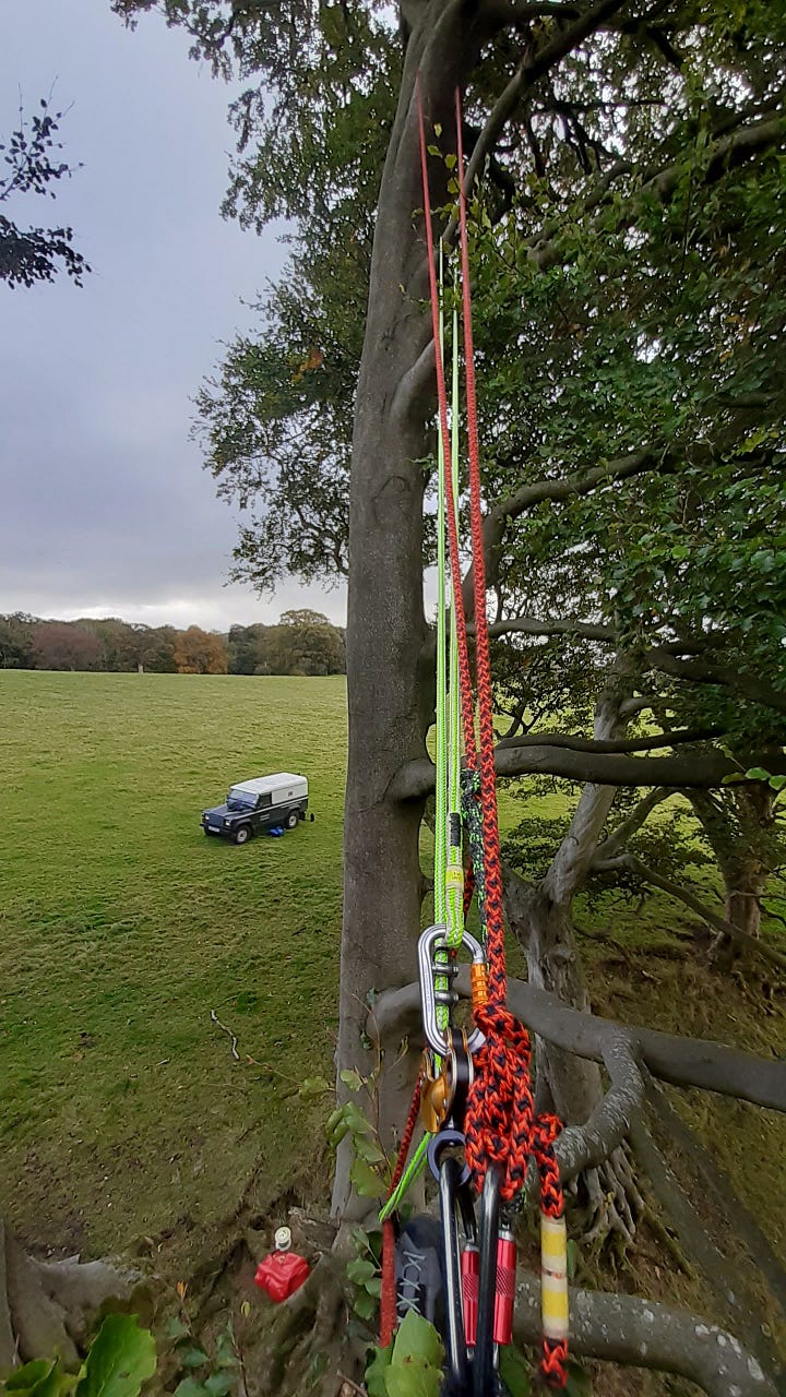 The rest of the week saw me spending as much time as possible in the trees. As one of the training days drew to a close, we were given the option of what we wanted to practise - where one of the other students on the course opted to get a head start on the rush hour traffic, and the other worked on throwing his lines over branches, I couldn’t get into a tree fast enough. I had not anticipated what an itch tree climbing would scratch for me. All the exposure of rock, the ability to look down and see nothing beneath my feet but air, but without the stress, the fear of being metres above a single sketchy cam while forearms drain of energy. Instead, two independent rope systems looped around two fat branches and no more than 50cm of slack, a cradle in comparison. Not to be blasé, I know full well that trees can be unpredictable, that there’s a myriad of things you need to look out for, and you’re supposed to use two separate ropes for good reason. But I have always found that the higher you get off the ground, the easier it is to breathe. To open yourself up to the world around you and take it in. The higher up you are, the smaller the petty stresses of life can seem.3 When I am up, my brain, usually running at 100 miles an hour, falls quiet. My world simultaneously narrows to a single point of focus - the climb - and opens up to the endless expanse of the sky, where nothing is really that important. One of the instructors said that the best feeling of all was making it all the way to the top of the canopy and poking your head out the top, seeing everything laid out around you, you above it all. I didn’t manage to get to that point in any of my trees, but I literally cannot stop thinking about that situation, cannot stop looking at the trees around me, wondering what it would be like to be perched up there. How close to absolute freedom it would feel, nothing between you and the birds but a pair of wings.